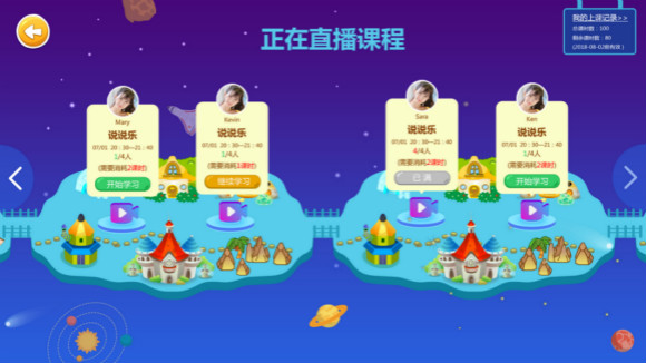 为了增强学生在线上课堂的学习兴趣,贝乐还有意将在线课程的界面进行了趣味性设计。4人小班课程被设计为四向课桌的布局模式,冯菲将其比喻为“欢乐斗地主般的课堂”。