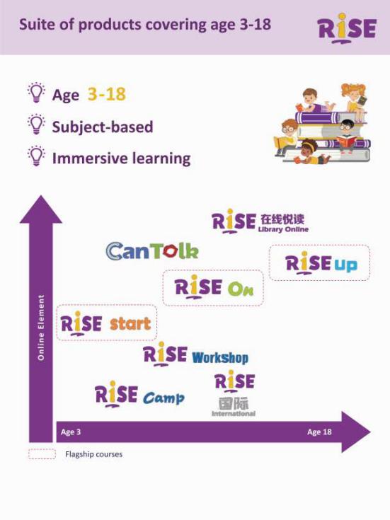 瑞思主要有面向3-5岁儿童的Rise Start、针对6-12岁小学生的Rise On和面向13-18岁学生的Rise Up三个主要课程。其中,Rise Start培养英语兴趣,锻炼口语表达为主;Rise On是学科英语,学生在课程中意英语思维解决数学、科学问题,并通过阅读来习得语法;Rise Up则是瑞思在2015年推出的课程,以在线学习为主,由美国老师一对一授课。