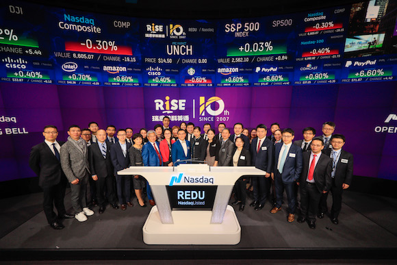 多知网10月20日消息,美国东部时间9点30分,瑞思学科英语在美国纽交所敲响开盘钟声,正式登陆美国纳斯达克市场,股票代码为“REDU”,开盘价16美元,较发行价14.5美元上涨10.3%,开盘后两小时上涨至16.82美元,涨幅5.1%,总市值9.21亿美元。