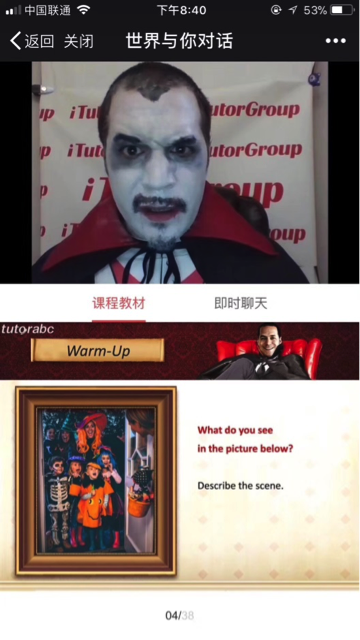 多知网11月3日消息,万圣节期间,tutorabc开设了一节名为“德古拉伯爵带你夜会吸血鬼” 的万圣节主题课程。