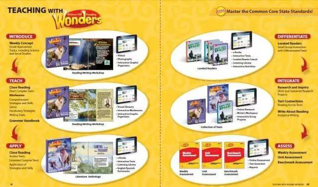 “Wonders”是全球第一套根据美国最新共同教育大纲(CCSS)编写的核心教材,是此前美国主流小学教材Treasures的升级版。从2013年开始,Wonders已全面替代旧版Treasures教材。目前在美国加州,Wonders是学校用于课堂母语教学的主要课本(其功能相当于国内中小学语文教材)。按照要求,学员在学完Wonders整套课程之后,能够达到美国教育部要求的美国中学生阅读水准。而从2014年开始, SAT(美国高考)和IBT托福考试的阅读难度将与新大纲要求的阅读水准一致。