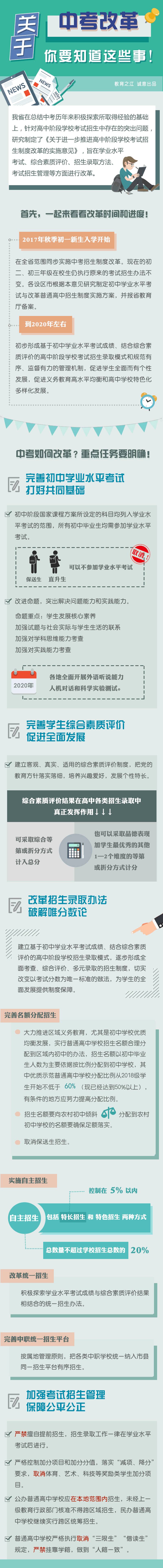 据浙江省教育厅教育之江报道,浙江省教育厅召开新闻通气会,正式发布了《关于进一步推进高中阶段学校考试招生制度改革的实施意见》。《意见》提出,从2017年秋季初一新生入学开始,在全省范围同步实施中考招生制度改革;到2020年左右,初步形成基于初中学业水平考试成绩,结合综合素质评价的高中阶段学校考试招生录取模式;综合素质评价结果将在高中各类招生录取中将真正发挥作用。