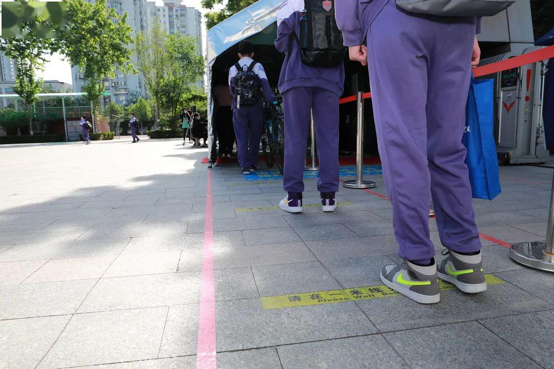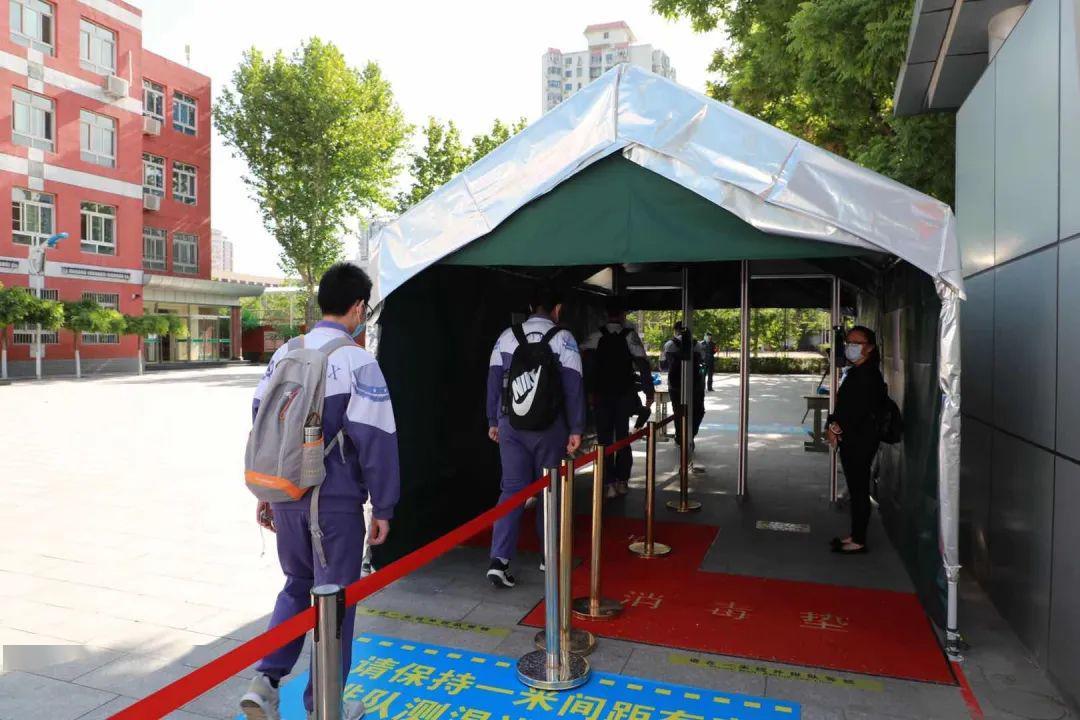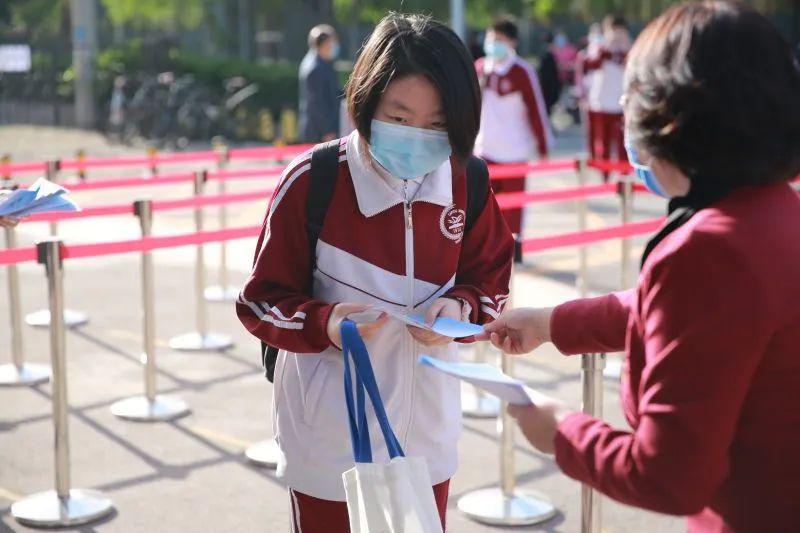 ▲ 北京市赵登禹学校的同学们依次走入校园,接受体温检测。