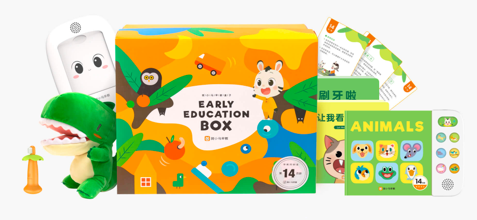 从产品具体形态来看,斑小马早教的产品与斑马AI课形态基本类似。教学产品主要包括实物玩具、学习机、绘本、早教卡、配套视频等内容,构成一个礼盒。根据官方信息显示,该礼盒每月寄送一次,其对应早教内容也会根据儿童的不同月龄进行针对性调整。