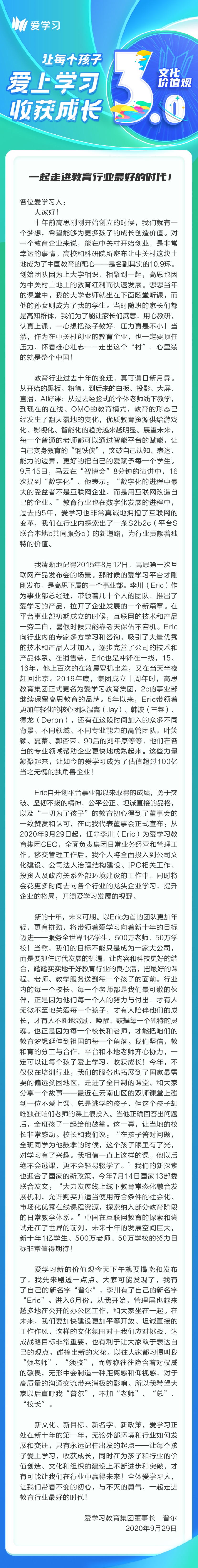 此外,须佶成发布了以《一起走进教育行业最好的时代!》为题的内部信,信中,他表示:“在新的十年,爱学习将向着服务全世界1亿学生、500万老师、50万学校的新目标前进。”