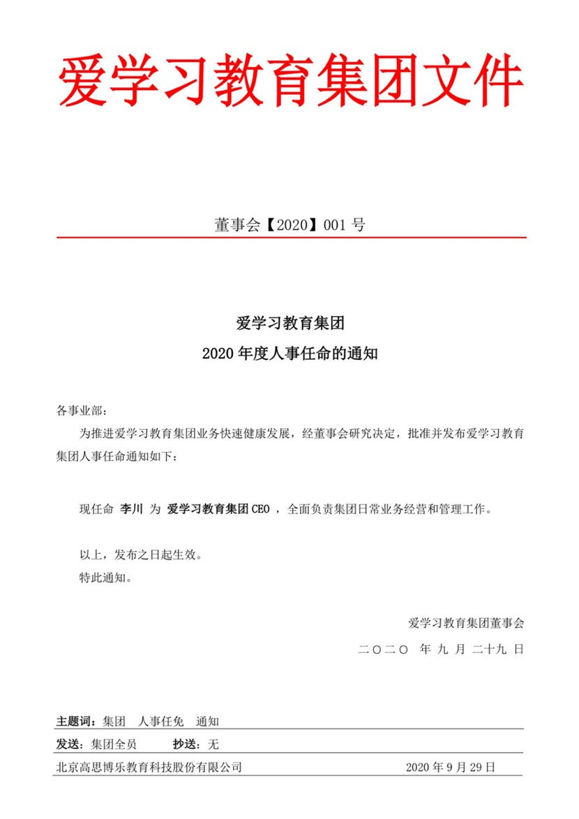 多知网9月29日消息,爱学习教育集团发布2020年度人事任命通知,任命李川为爱学习教育集团CEO,全面负责集团日常业务经营和管理工作。此前,李川在爱学习担任联合创始人、总裁一职。