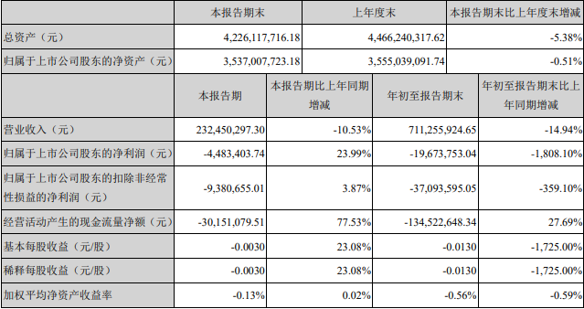报告期内,营业收入2.32亿元,同比下降10.53%;归属于上市公司股东的净亏损448.34万元,同比亏损缩窄23.99%;归属于上市公司股东的扣非净亏损938.07万元,同比亏损缩窄3.87%。