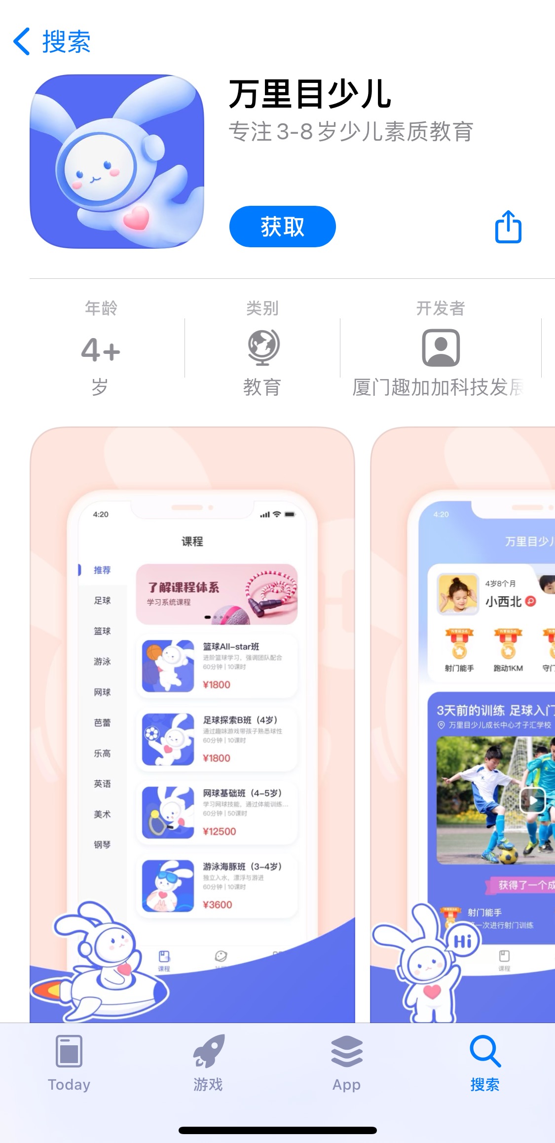 万里目少儿App是一个家长管理2-8岁孩子学习的平台。从开设课程来看,目前显示有篮球、足球、网球、芭蕾、乐高、钢琴、游泳、英语、美术等9项科目,每个科目下会显示孩子在不同年龄层次所对应的课程,课程的价格也随着年龄不同而有所增加。