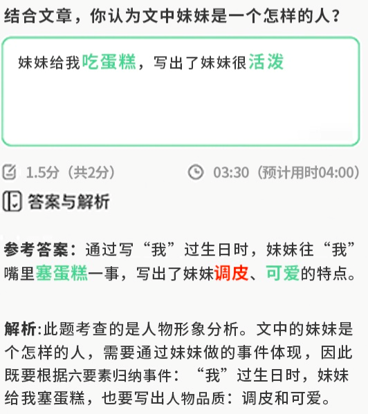在精批环节,一般的线上阅读答题都是选择或判断,而快解阅读做了主观题批改,真实还原阅读情景。同时,快解阅读能够活题活判,灵活抓取采分词及相似采点,有效训练学生采分思维。
