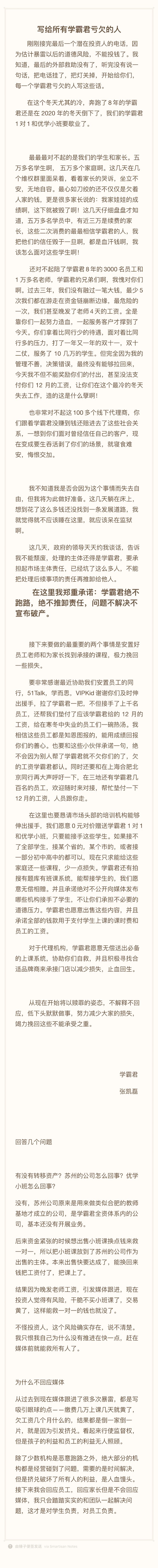 多知网1月2消息,2021年元旦晚间,张凯磊发布了一封公开信,信中写到:学霸君的潜在投资人因为估计暴雷风险,不能投钱了。学霸君的1对1和优学小班要歇业了。但是,张凯磊承诺:学霸君绝不跑路,绝不推卸责任,问题不解决不宣布破产。