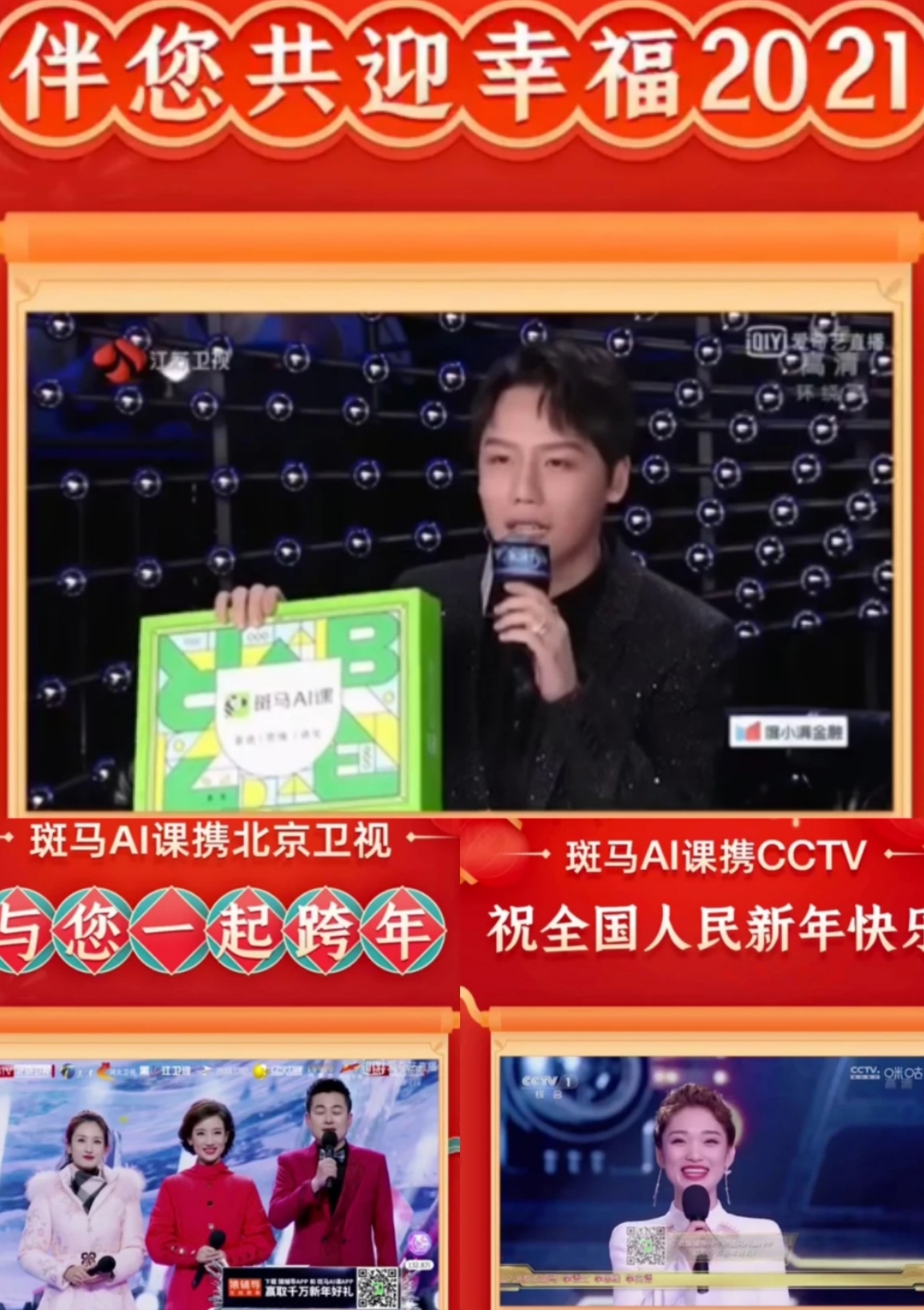在北京卫视跨年晚会上,主持人多次对斑马AI进行口播:“下载斑马AI课APP,即可领取一万份2~8岁趣味动画AI课,还有一万份绘本教辅礼盒新年大奖。”央视的跨年晚会除了主持人的口播外,还摆放了许多印有斑马AI课LOGO的礼盒。
