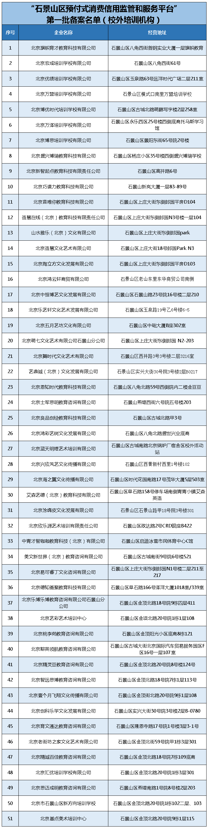 石景山区首批被纳入预付费监管平台的51家校外培训机构如下: