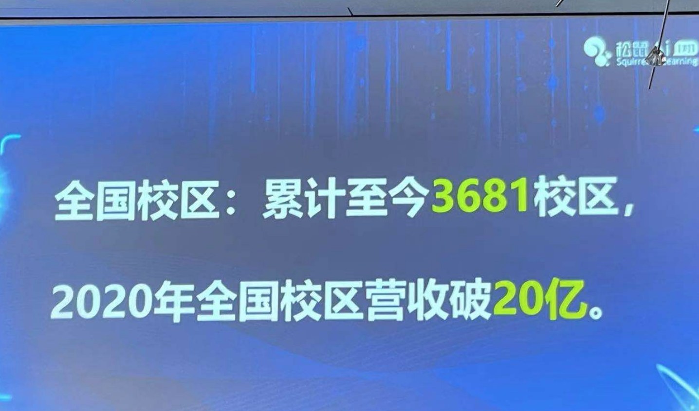 “截至2021年1月21日,松鼠Ai全国校区累计达3681校区,2020年全国校区营收破20亿元,校区平均面积达500平。”周伟说道。