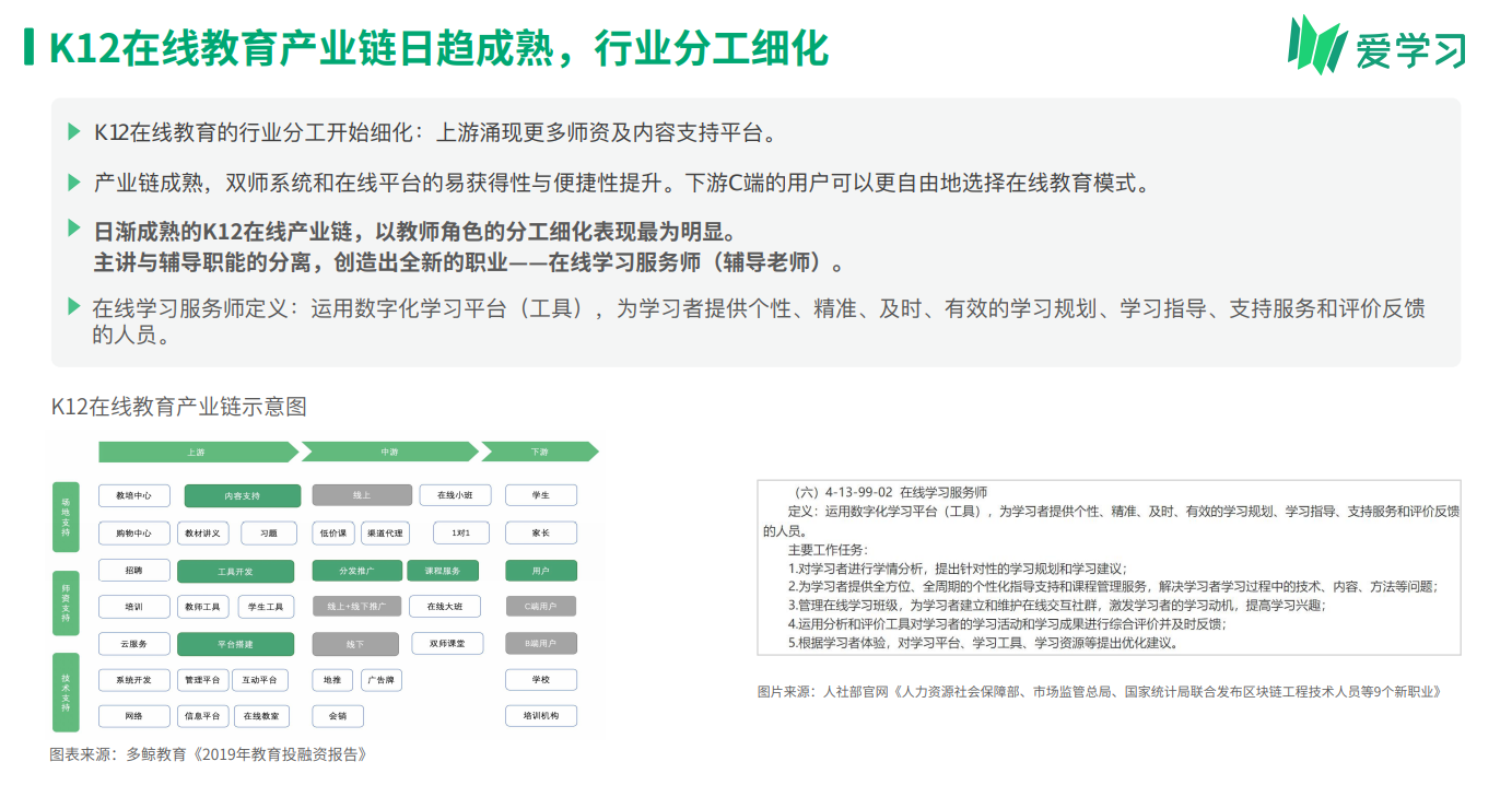在K12在线教育日渐成熟的产业链中,以教师角色的分工化表现最为明显。主讲与辅导职能的分离,创造出全新的职业——在线学习服务师(辅导老师)。