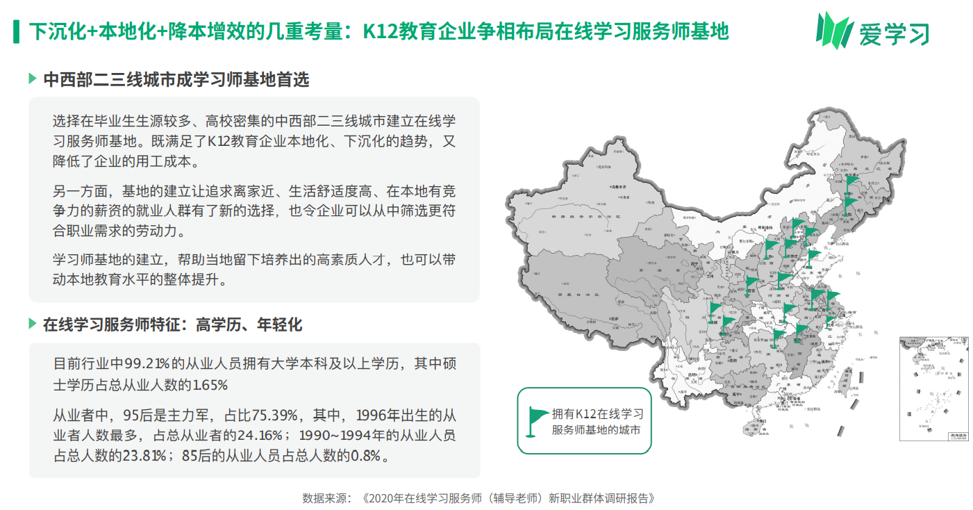 公开资料显示,武汉、长沙、成都等毕业生生源较多、高校密集的中西部二三线城市成为教育机构优先选择的在线学习服务师基地。既满足了K12教育品牌本地化、下沉化的趋势,又降低了企业的用工成本。另一方面,基地的建立让追求离家近、生活舒适度高、在本地有竞争力的薪资的就业人群有了新的选择,也令企业可以从中筛选更符合职业需求的劳动力。