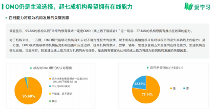 多知网3月22日消息,近日K12教育供给平台爱学习教育发布《下沉市场K12教育培训行业调研报告》。报告指出,经过一年多时间,教育OMO成为行业共识,绝大多数机构都认同OMO模式是未来的主流教育模式。报告显示,95.6%的机构认同“未来的教育模式一定是OMO(线上线下相结合)”这一观点,77.14%的机构想拥有推出在线课的能力。