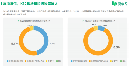 与此同时,机构转在线的方式从疫情初期的借助直播平台逐渐过渡到与第三方教学解决方案平台合作为主。2020年疫情爆发后,直播工具类软件,如钉钉等成为教培机构转线上的主要方式。但在2021年,86.57%的机构选择与能够提供全套在线教学解决方案的平台进行合作。