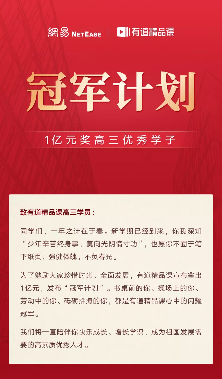 多知网3月26日消息,网易有道精品课发布“冠军计划”,设立1亿元奖高三学子。