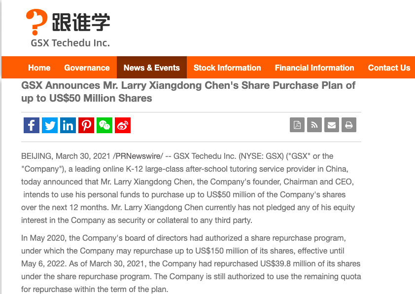 多知网 3月30日消息,在线教育公司跟谁学(GSX.US)创始人、董事长兼CEO陈向东宣布一项股票增持计划,基于对公司的长远信心,其个人将于一年内增持不超过5000万美元的公司股票。