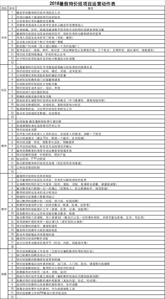 然后,从市场、校区、教务、教学、助教五个方面,进行系统性、细致化和标准化的统一动作设计与部署,尽可能将每一个环节做到位、不同环节之间的协调配合做到位。梳理了“特价班”的工作清单共185项,部分如下: