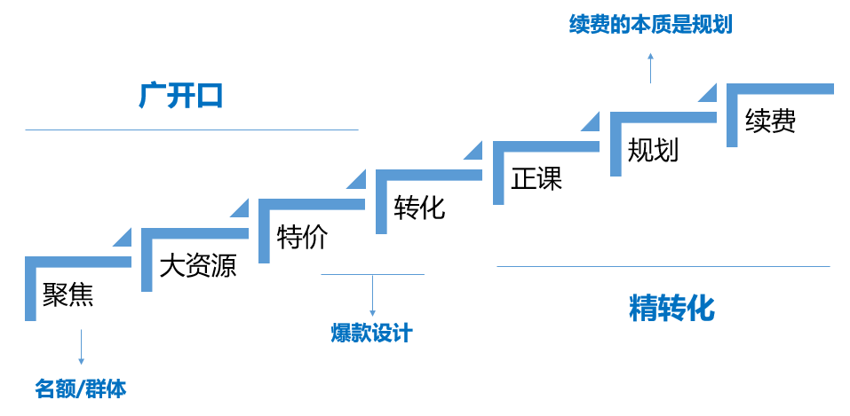 实际上,特价班的运营应该设置2-3年的长期规划,为教师队伍提供稳定的成长空间,为研发和销售团队提供充分的打磨机会,同时,招生和续班效果也可以以更长的周期来监测数据变化和攀升;在逐年的尝试中总结经验。以教学质量为核心,让学员切实感受到收获和改变,口碑不断累积,招生和续班就成为顺其自然的事情。