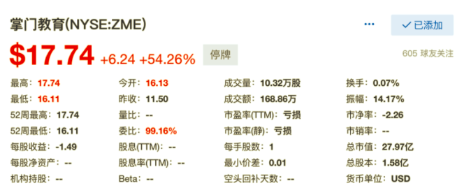 今天,掌门教育(NYSE:ZME)正式登陆纽交所,其首次公开发行定价为每ADS 11.50美元,发行股数为362.3万股,总发行规模为4170万美元。开盘价为16.13美元,较发行价上涨40%。随后涨幅扩大至78.4%,盘中两度触发熔断。