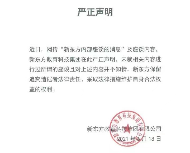 新东方保留追究造谣者法律责任、采取法律措施维护自身合法权益的权利。