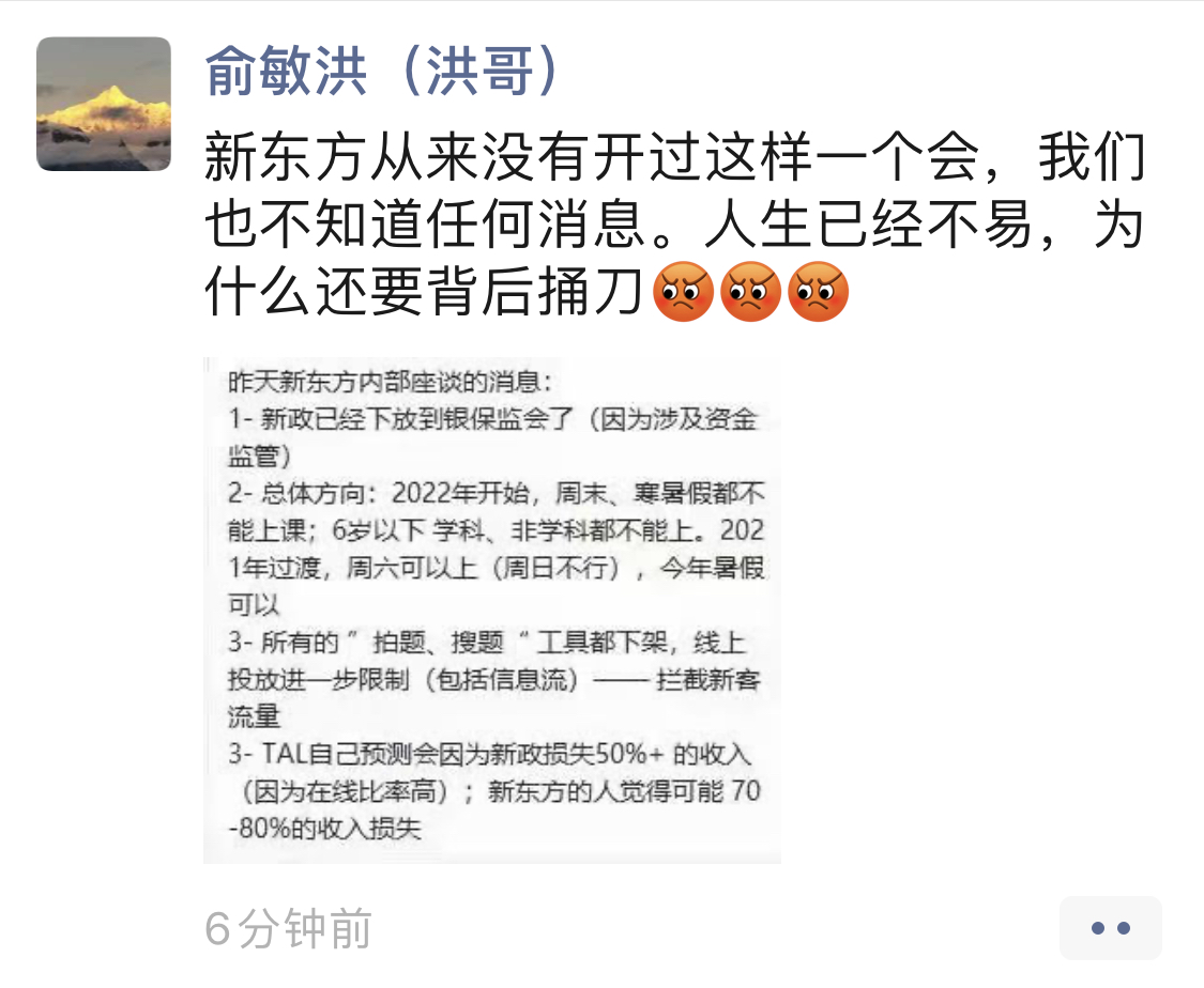 对于这一谣言,新东方集团创始人俞敏洪在朋友圈回应道:“新东方从来没有开过这样一个会,我们也不知道任何消息。人生已经不易,为什么还要背后捅刀?”