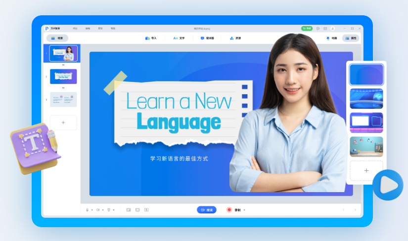 课件制作方面,用户仅需输入项目主题关键词,便可一键AI生成大纲。用户确认大纲、选用模板即可调用AI自动生成演示文档。此外,用户也可通过自选模板、拖拽素材、填充内容,搭积木式完成演示文档的创作。通过多场景多样式的演示模板及动画特效素材,万兴智演可有效提升演示文稿的互动性。