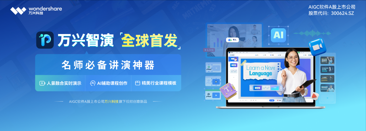 多知网9月8日消息,创意软件A股上市公司万兴科技(300624.SZ)面向泛知识领域,发布老师讲演神器“万兴智演”,该款AI演示新品集成强大的AIGC能力、精美的行业课程模板以及动画特效素材,简化课件制作过程。同时,内置录制、直播功能,通过真人实拍、演示内容相结合的形式,实现人景融合的实时演示效果,为讲师、知识博主、职场人士等用户群体带来更智能高效的视频讲演体验。