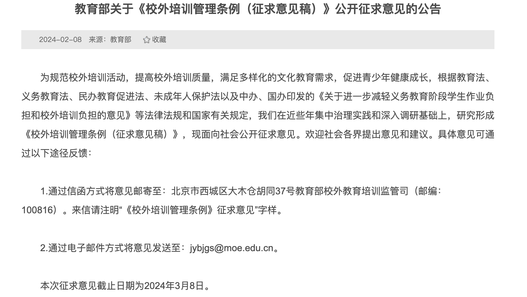 多知网2月18日消息,教育部近日发布关于《校外培训管理条例(征求意见稿)》公开征求意见的公告。本次征求意见截止日期为2024年3月8日。