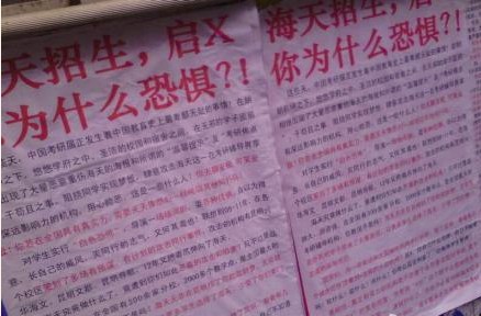 最近两家矛盾升级,在昆明各高校展板上互相攻击:启航称海天师资薄弱、欺骗学生;海天称启航卑鄙无耻。