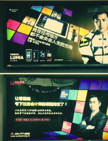 更有趣的是在去年,尚德机构广布一版会计和自考本科方面的广告。以蓝、绿、黄、紫等大色块作为背景,并在北京地铁大面积铺开投放。诺基亚(中国)资讯经理艾尔莎发微博称,“今天有个用户在我们官博里指责诺基亚抄袭了尚德机构的广告,汗”。