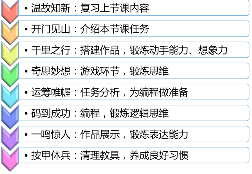 首先说我们的课堂环节,我还是以少儿机器人的课堂为例,我们每堂课包含8个标准环节:温故知新,复习上节课的内容;开门见山,介绍本节课的任务;千里之行,搭建作品;奇思妙想,我们会做游戏,以此来锻炼学生的抽象逻辑思维能力,发散性思维能力,逆向思维能力等等,来为编程做准备;第五个环节运筹帷幄就是任务分析,为编程做个思路,画流程图;第六个码到成功,就是要做编程了。第七一鸣惊人,我们要做作品展示;最后按甲休兵,清理教具。我们在整个视频过程中,把这8个环节固化起来。