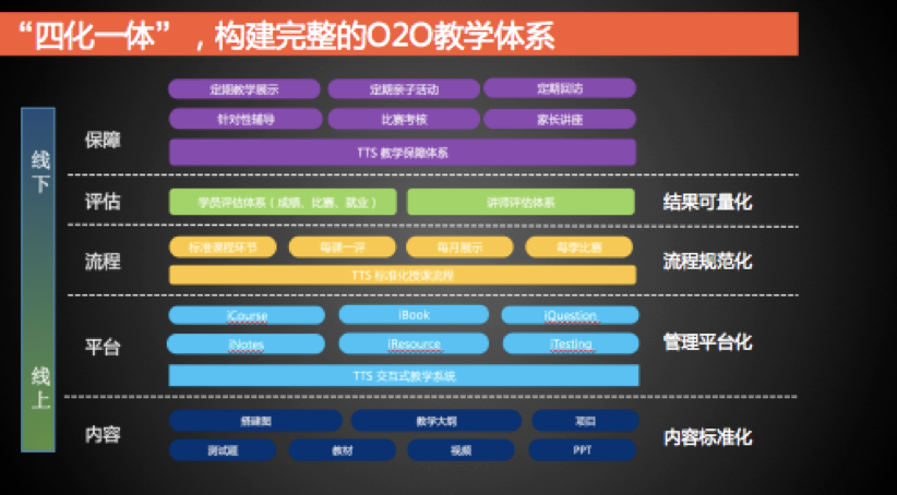 光有了完善的课程体系还不够,要想把整个教学做好,我们还需要配套的教学系统,我们起了一个名字叫四化一体:教学内容标准化、过程规范化、管理平台化、结果可量化,再加上线上线下一体化,接下来我会一个一个介绍。