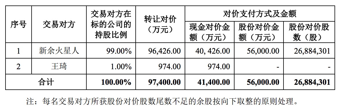 火星时代100%股权定价为9.74亿元。其中:百洋股份以发行股份方式向交易对方支付5.6亿元,以现金方式支付4.14亿元。