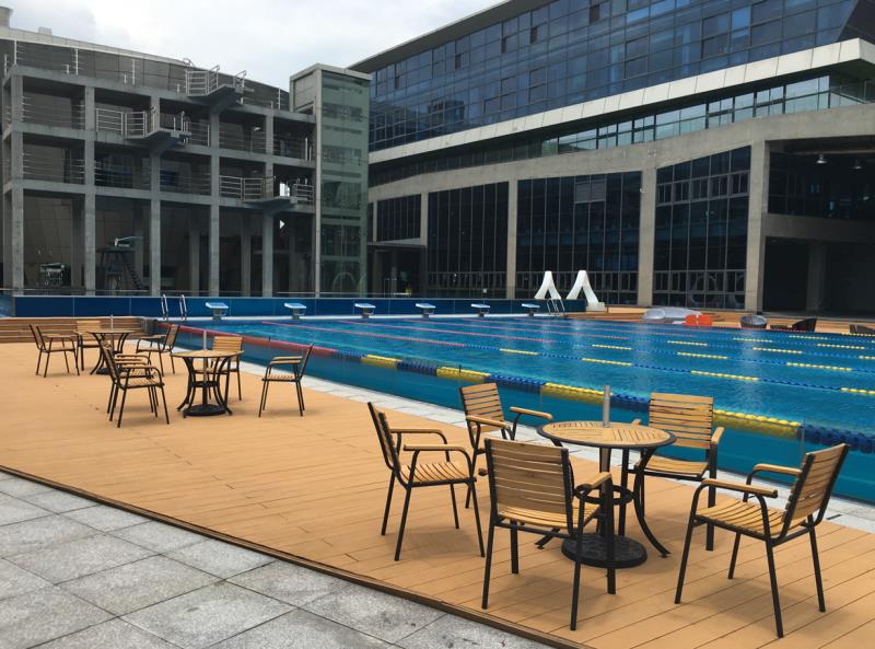 在室外运动设施中,体育场承担了大多数的文体活动,除普遍的篮球、足球、羽毛球场地外,还有室外国际标准的泳道和跳水台。网龙自配培训班和职业教练(据说很帅),保证职工的安全和专业学习。