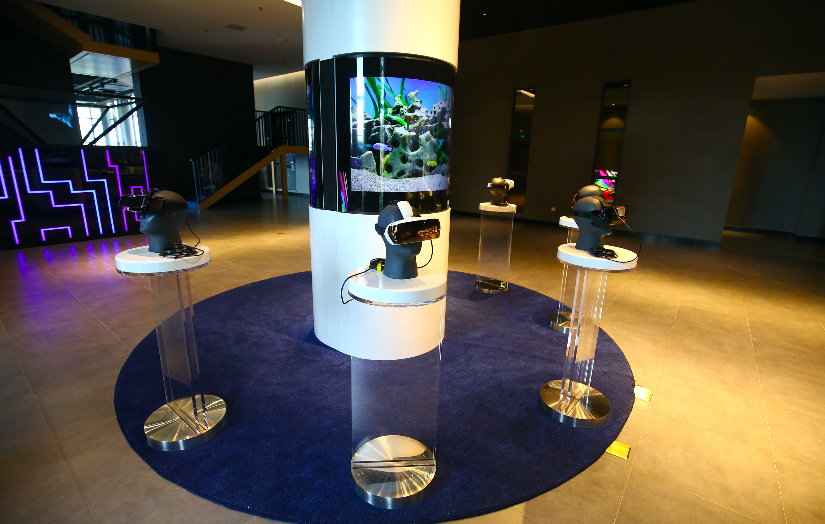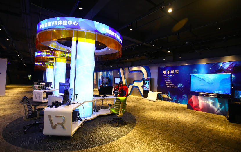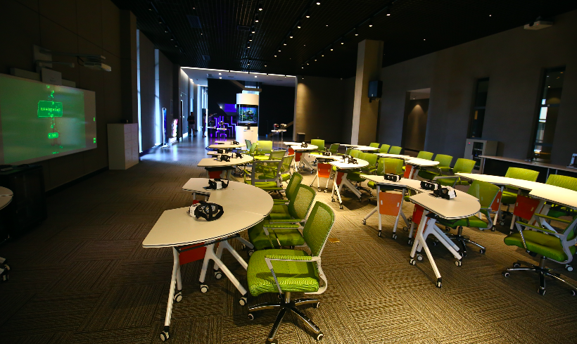 目前VR体验中心包含5块体验区:成果展示区、休息区、沉浸教室、应用体验区、乐空间。