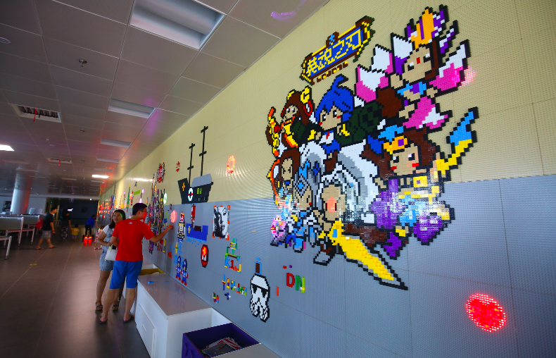 (乐高墙,下面的积木盒子可供员工自由发挥,包含近十年的乐高成规模各个版本都有,及部分停产、稀有零件)