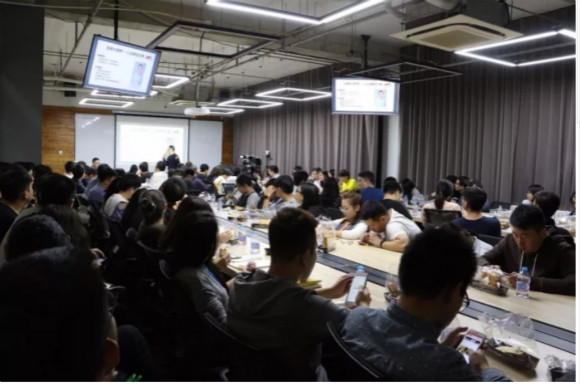 此时,在大会议室“居鲁士”里,即将开始一场培训会,进入会场前的员工们在进行登记。据介绍,像这种培训活动每周会不定时地举办多场,员工们都会可以在公司系统中报名参加。