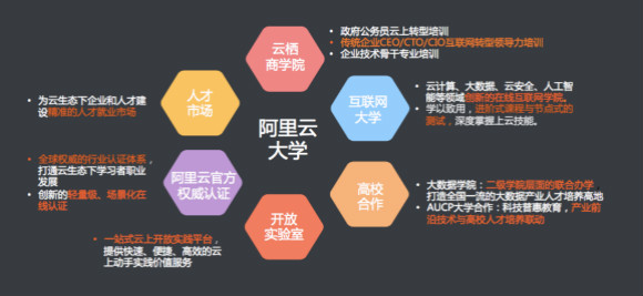 在高校合作方面,阿里云大学已和六所高校落地“阿里云大数据学院”,这是阿里云大学与学校在二级学院层面的联合办学,目的是打造全国一流的大数据产业人才培养高地。