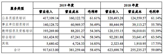根据中公披露的各产品序列的毛利率,2019 年度,公务员招录考试培训作为公司最早业务也是最成熟产品,平均培训人次收费价格较高,因此其毛利率高于公司整体毛利率 3.16个百分点;事业单位招录考试培训虽然也较为成熟但收费价格稍低,因此毛利率低于公务员考试培训;由于教师资格考试培训人均收费低,从而影响教师序列毛利率低于整体毛利率;综合培训序列虽然有较多新业务,但毛利率与整体毛利率基本持平。同时,各培训序列 2019 年和 2018 年度的毛利率相比较为稳定。