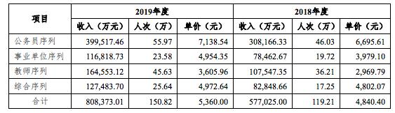 关于培训收入增幅显著高于培训人次增幅的合理性,中公回复称,2019 年度面授培训收入增长 40.09%,培训人次增长 26.51%,培训单价增长10.73%,培训收入增幅明显高于培训人次增幅,主要系受各培训序列产品价格提升及结构变化共同影响。