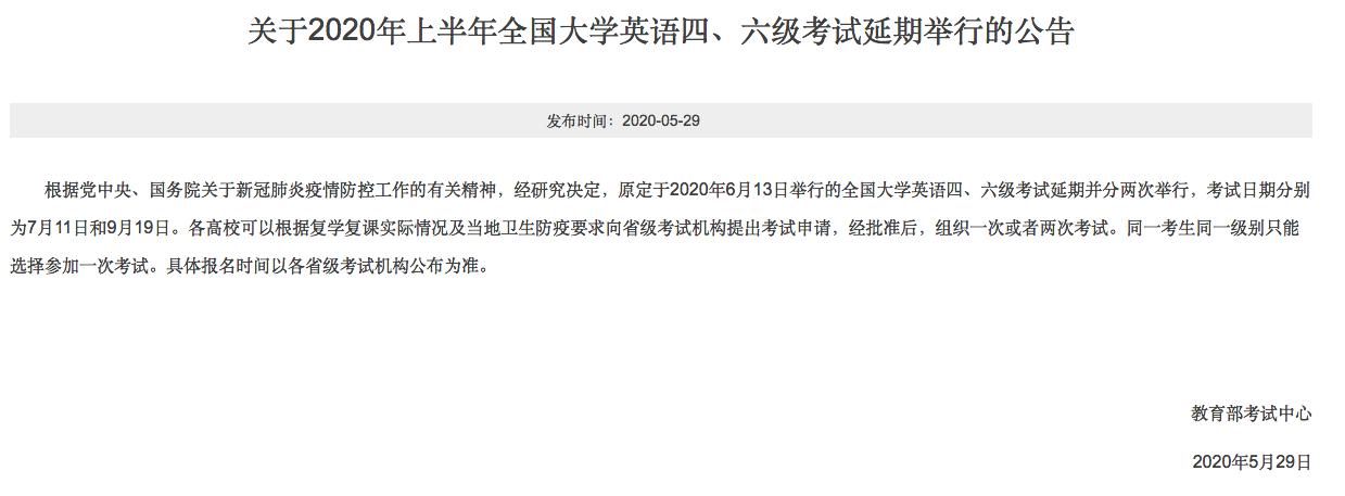 多知网5月29日消息,教育部发布公告表示,原定于2020年6月13日举行的全国大学英语四、六级考试延期并分两次举行,考试日期分别为7月11日和9月19日。
