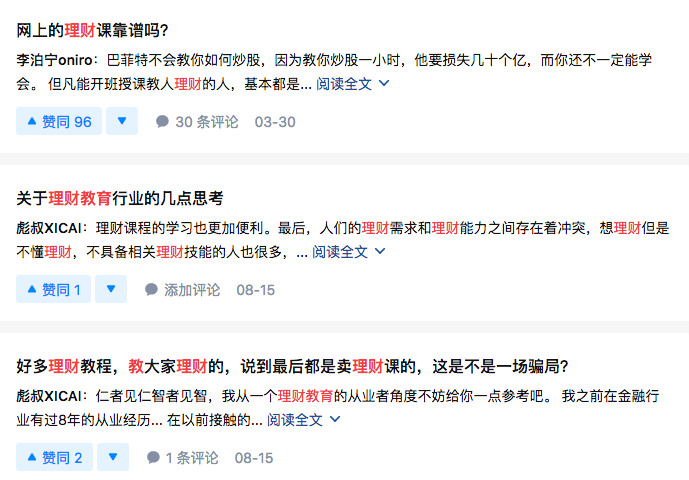 在知乎上,搜索理财教育,排名前三的问题分别是:“网上的理财课靠谱吗?”、“关于理财教育行业的几点思考”、“ 好多理财教程,教大家理财的,说到最后都是卖理财课的,这是不是一场骗局?”