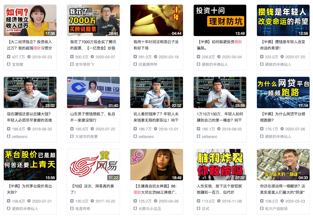 在B站搜索理财,一则名为“大二经济独立?投资收入过万?……”的视频播放量最高,达427.7万,同时B站上播放在百万以上的理财相关视频不是少数。