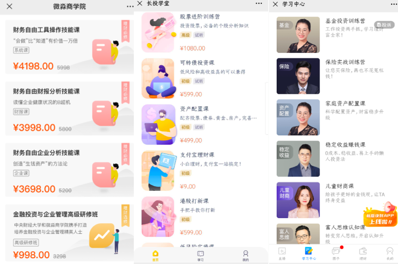 在产品形态上,目前头部几家机构的课程主要以低价入门课做导流,进而向更加细分的中高阶课程进行导流,其中微淼是12元低价课、长投和快财则直接采用免费课。