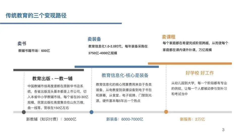职业教育赛道里面有太多这样的案例可以重新去思考和创新,因为大家都知道职业教育是最需要场景,最需要产品的。我举这个案例是想告诉大家,哪怕你专注在职业教育的出版领域,你都有巨大的机会。整个教辅书籍市场大概会从 600 亿快速地变成 3000 亿到 4000 亿。过去在 600 亿的市场里边,你没什么可玩的。但是如果变成 3000 亿到 4000 亿,职业教育赛道或者在其他教育赛道的创业者或者投资人都要重新思考。