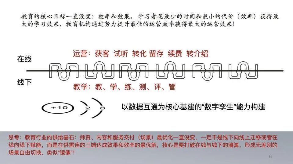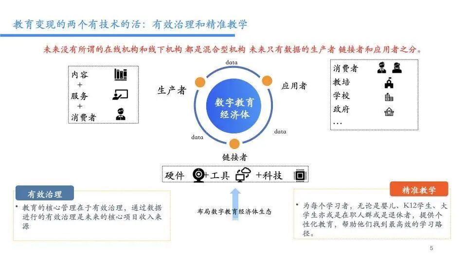 再来看这张图。教育变现的两个有技术的活:有效治理和精准教学。未来没有所谓的在线机构和线下机构,都是混合型机构。未来只有数据的生产者、链接者和应用者之分。