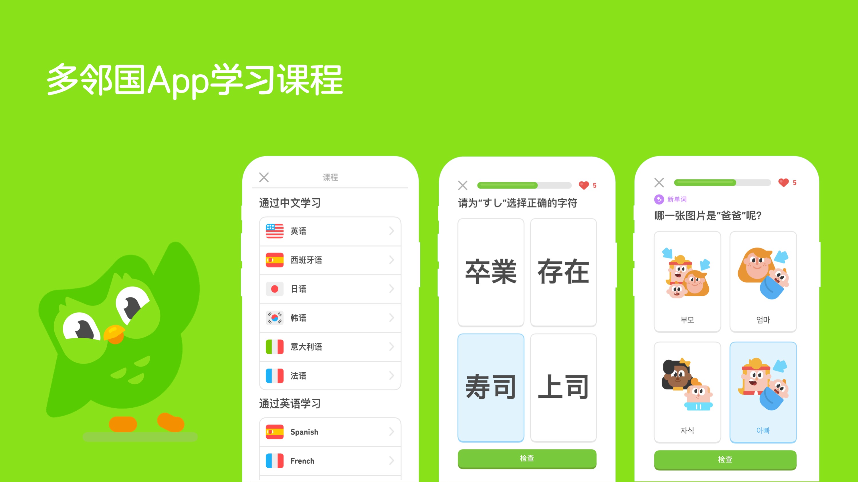 多邻国于2019年进入中国市场,目前已有超过1500万用户。中国用户已经可以使用中文学习英、日、韩、法、意大利和西班牙语这6门语言。如今,中国成为多邻国增长最快的国际市场之一。2020年上半年中国用户量对比去年同期比例为200%,其中,英、日、韩语为最受中国用户喜爱的语言种类。